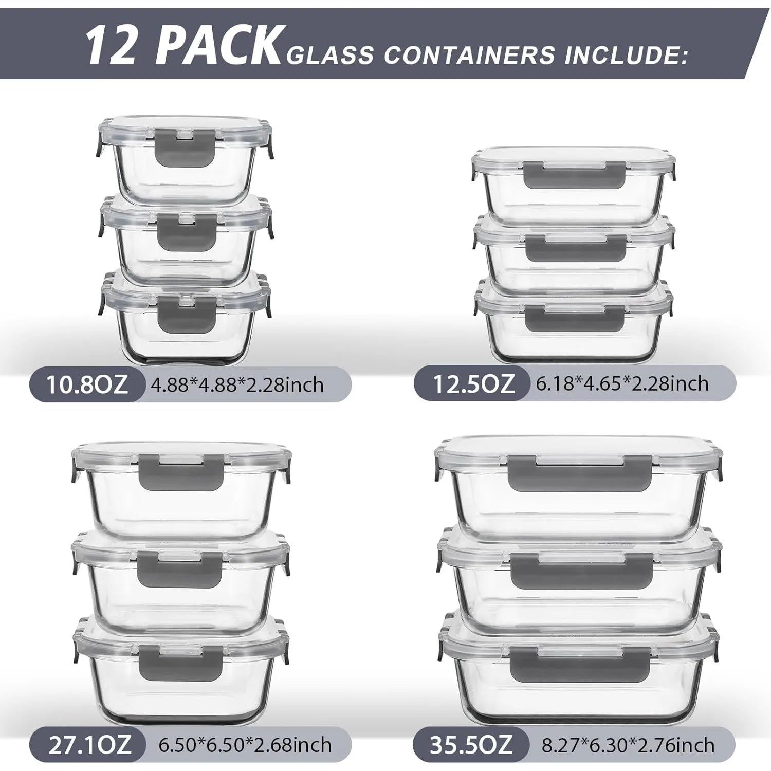 - 24-piece set with 12 containers and 12 airtight lids covers every portion: 3 rectangular 35.5 oz, 3 rectangular 12.5 oz, 3 square 27 oz, and 3 square 11 oz.