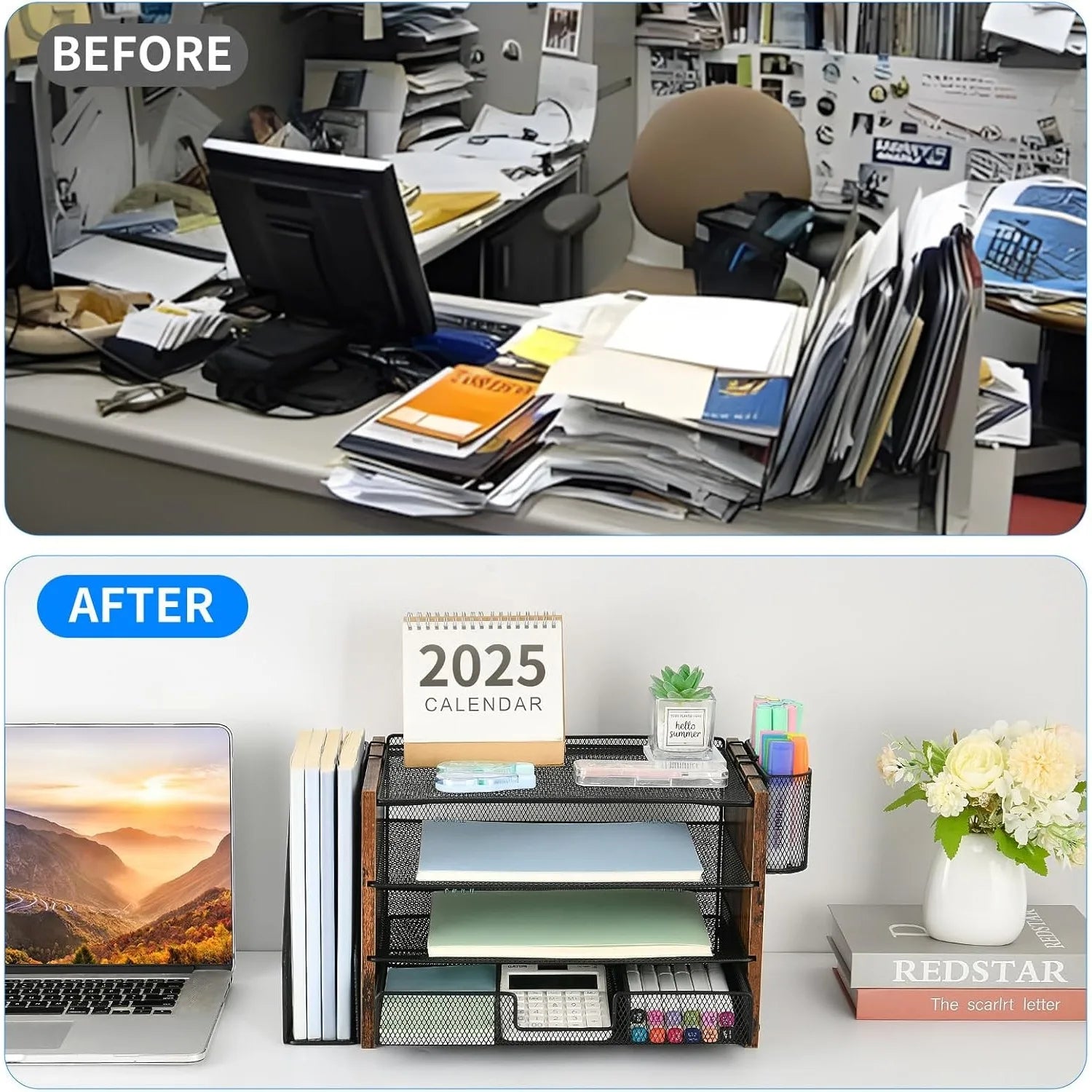 🎁【Multi-Functional Office Organization】Get your work area in order with the Desk Organizer! Featuring 4 spacious trays, a vertical file organizer, 2 convenient hanging pen holders, and a sliding drawer, you can store all your office supplies, classify and organize them, and keep your desktop tidy