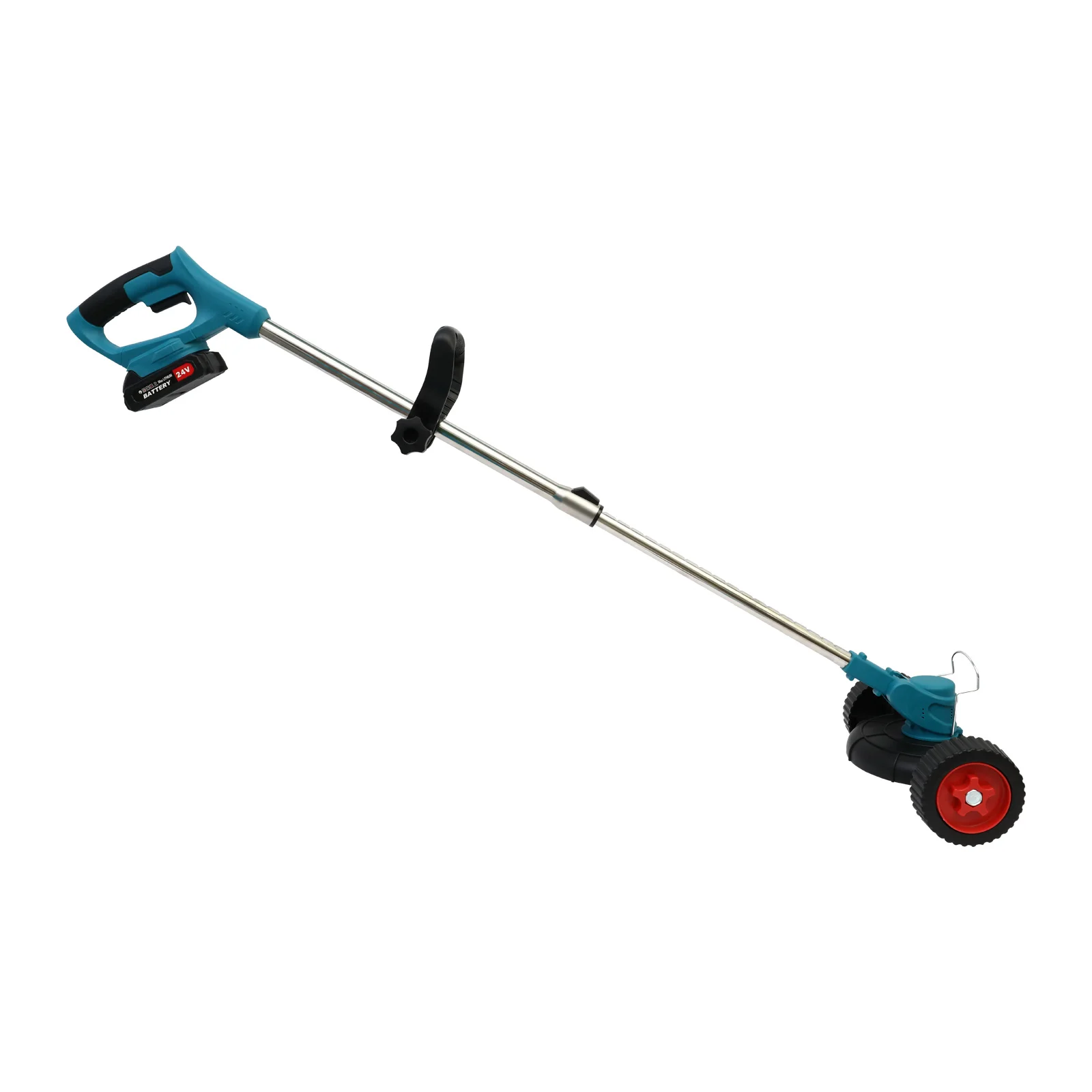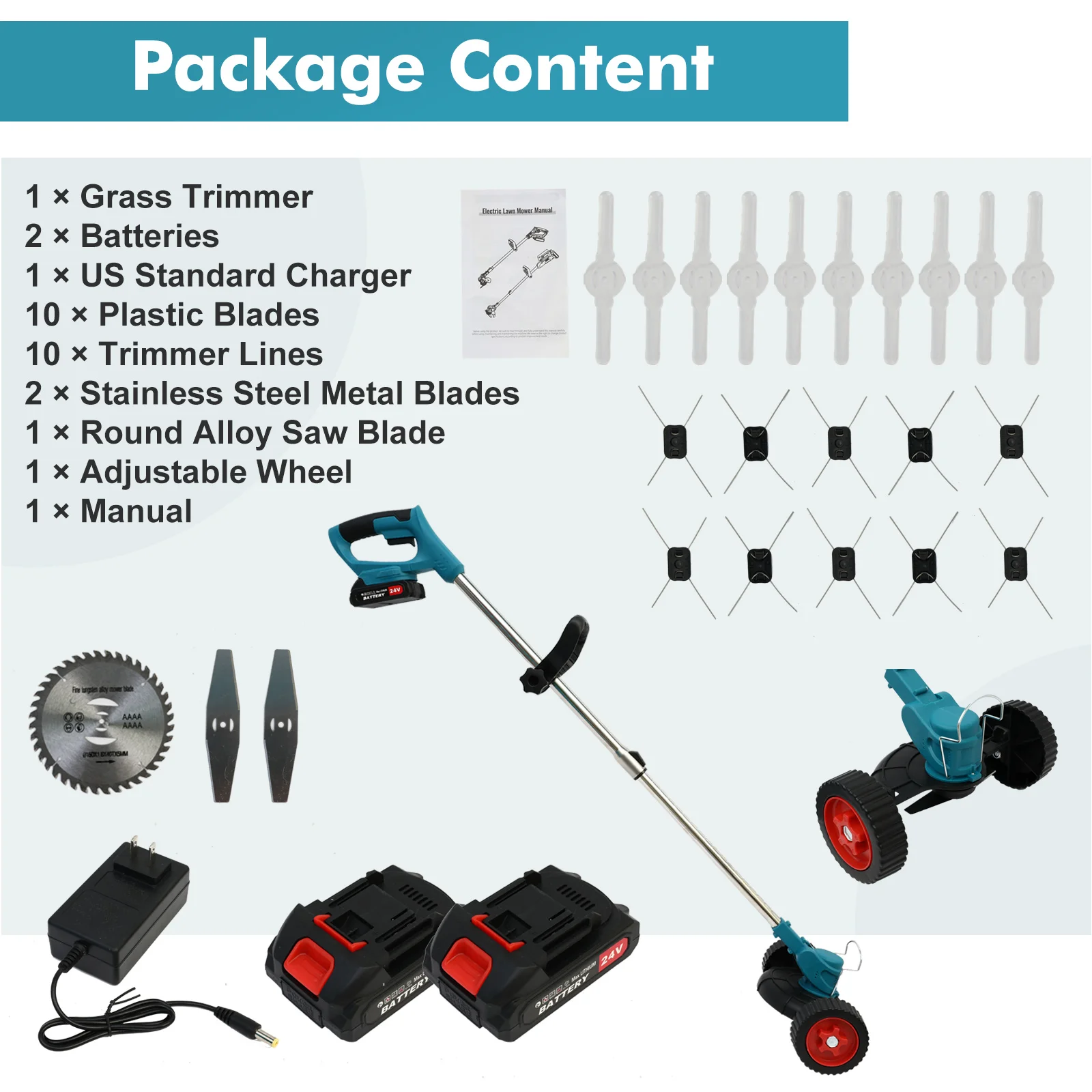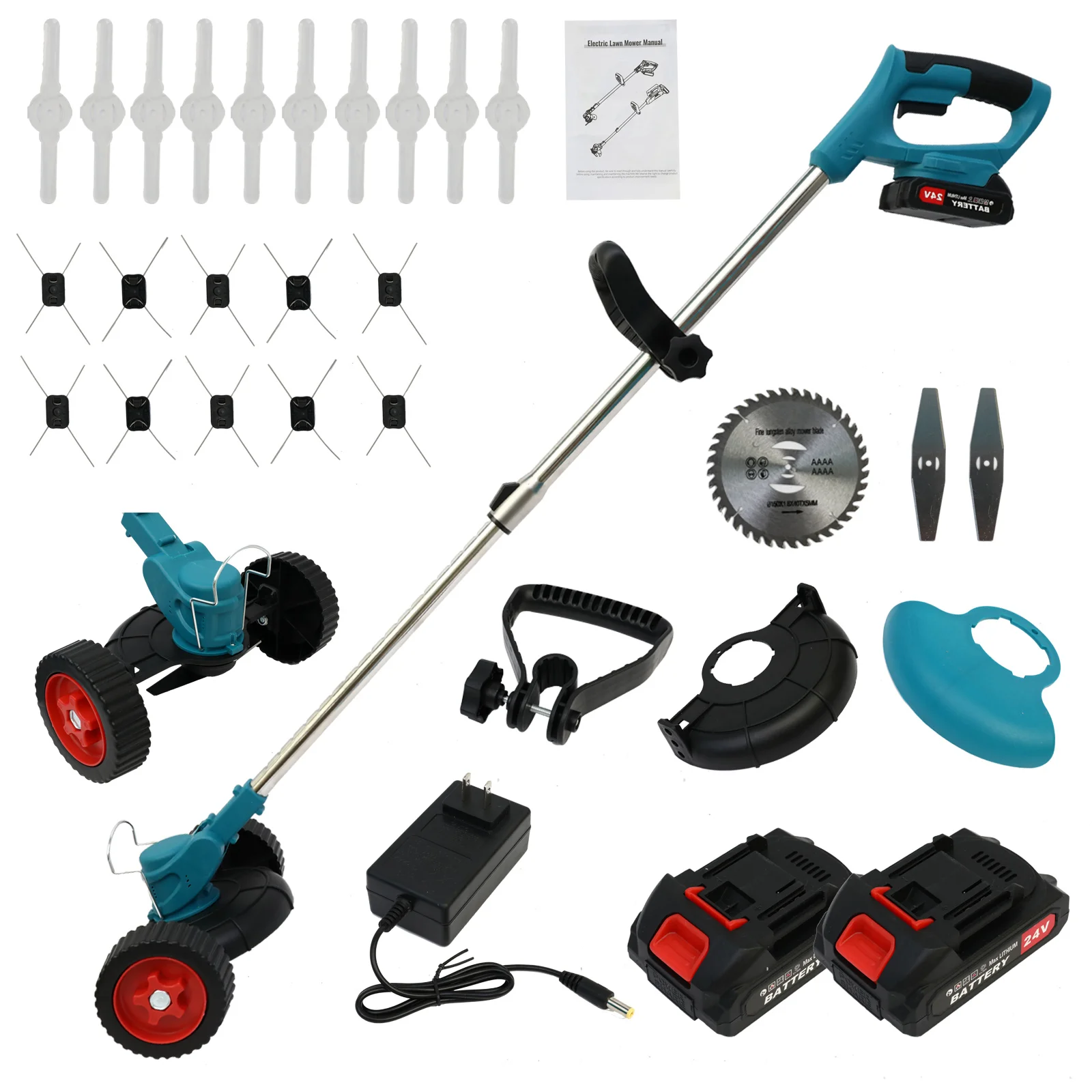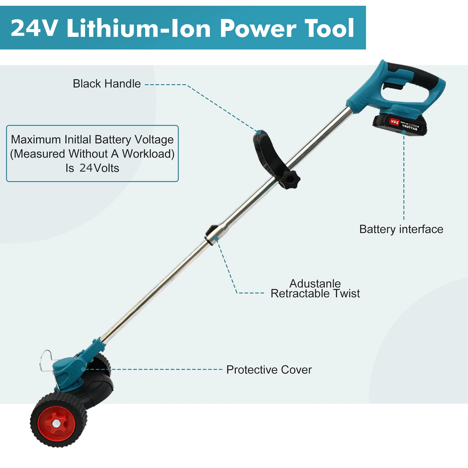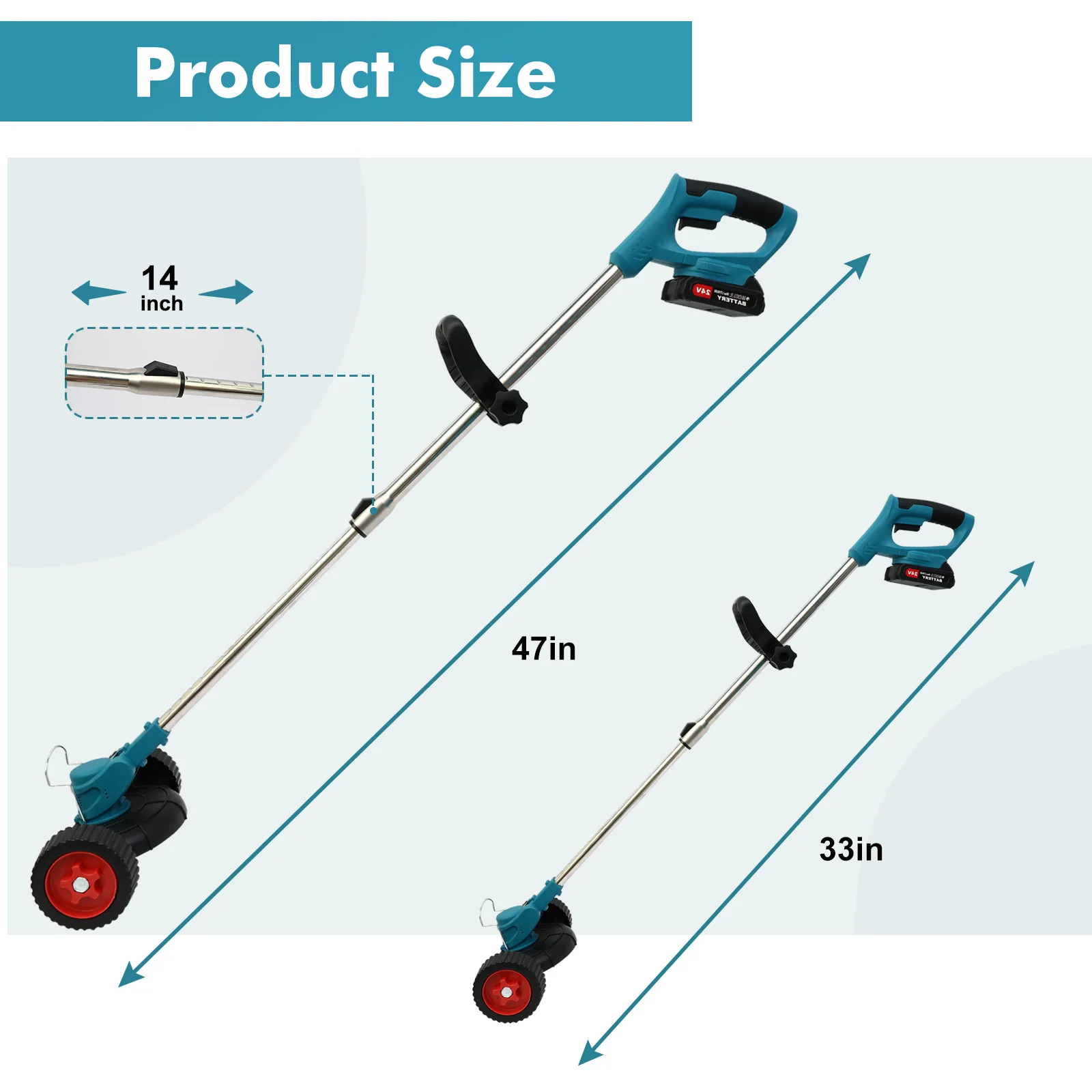 The high-efficiency cordless weed trimmer redefines lawn aesthetics. Designed for medium to small lawns, this battery-powered cordless trimmer revitalizes your outdoor space with exceptional performance. Maneuver effortlessly, trim without boundaries, and easily reach corners traditional mowers can't. Multi-functional, seamlessly switch between trimming and edging to create perfect borders. Enjoy a customized trimming experience with a comfortable telescoping shaft and soft grip. Low-noise design for a quieter, greener life. Long-lasting power with a visible battery indicator ensures worry-free operation. Durable and safe with a sturdy build and safety switch, it protects every operation. The T-shaped auxiliary wheel enhances stability and flexibility, making it easy to tackle various terrains. Choose this trimmer to rejuvenate your lawn and showcase endless charm!