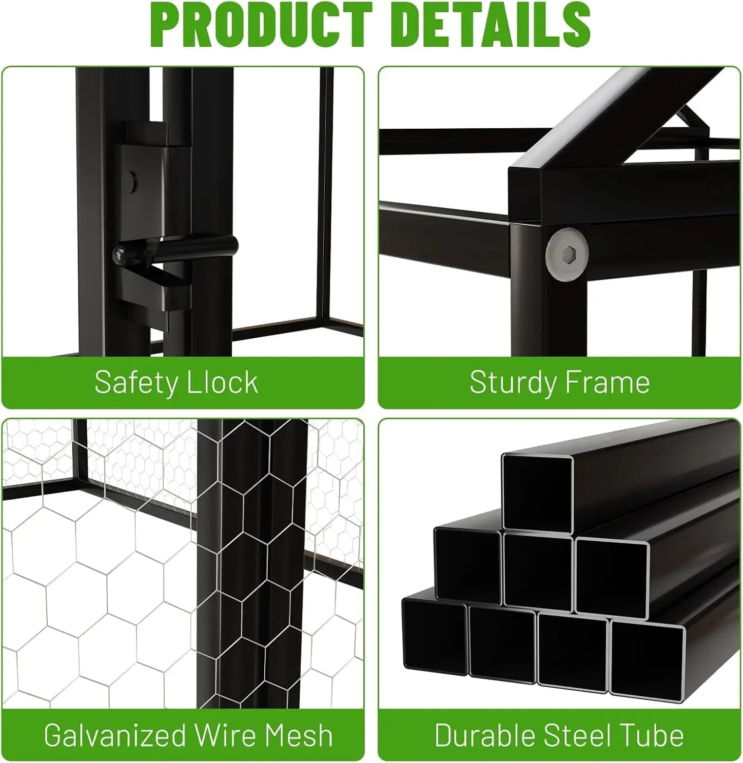 - Durable and Secure Materials: We used a thick iron pipe with a black anti-rust coating and galvanized wire mesh, this chicken coop is designed for durability and longevity. It features a lockable door and sturdy wire mesh to keep your chickens safe from weasels, foxes, and other predators.