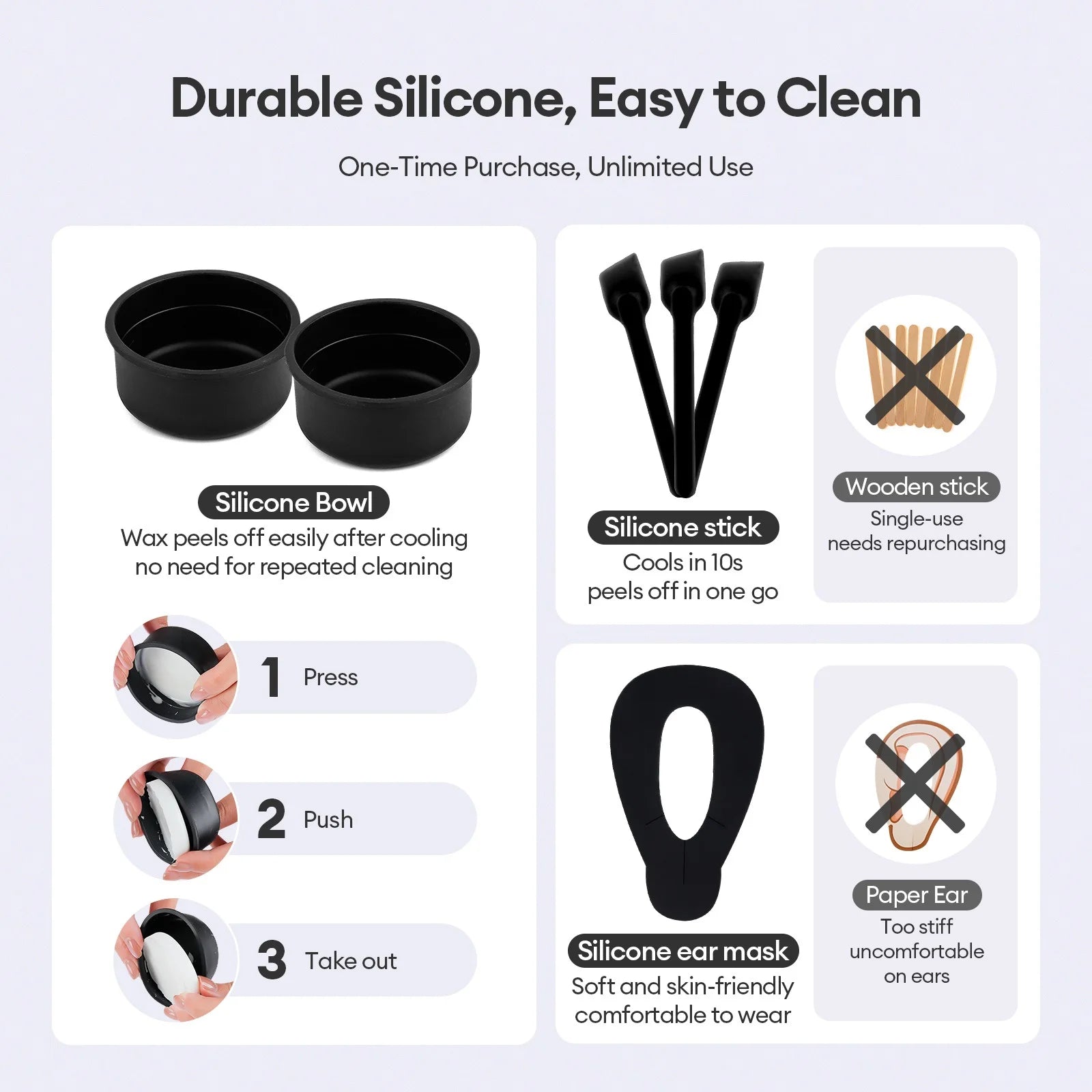 3.Easy to Clean. Built-in silicone bowl, heating evenly, wax after cold cut easily peel, no need to repeat cleaning, say goodbye to tedious steps.