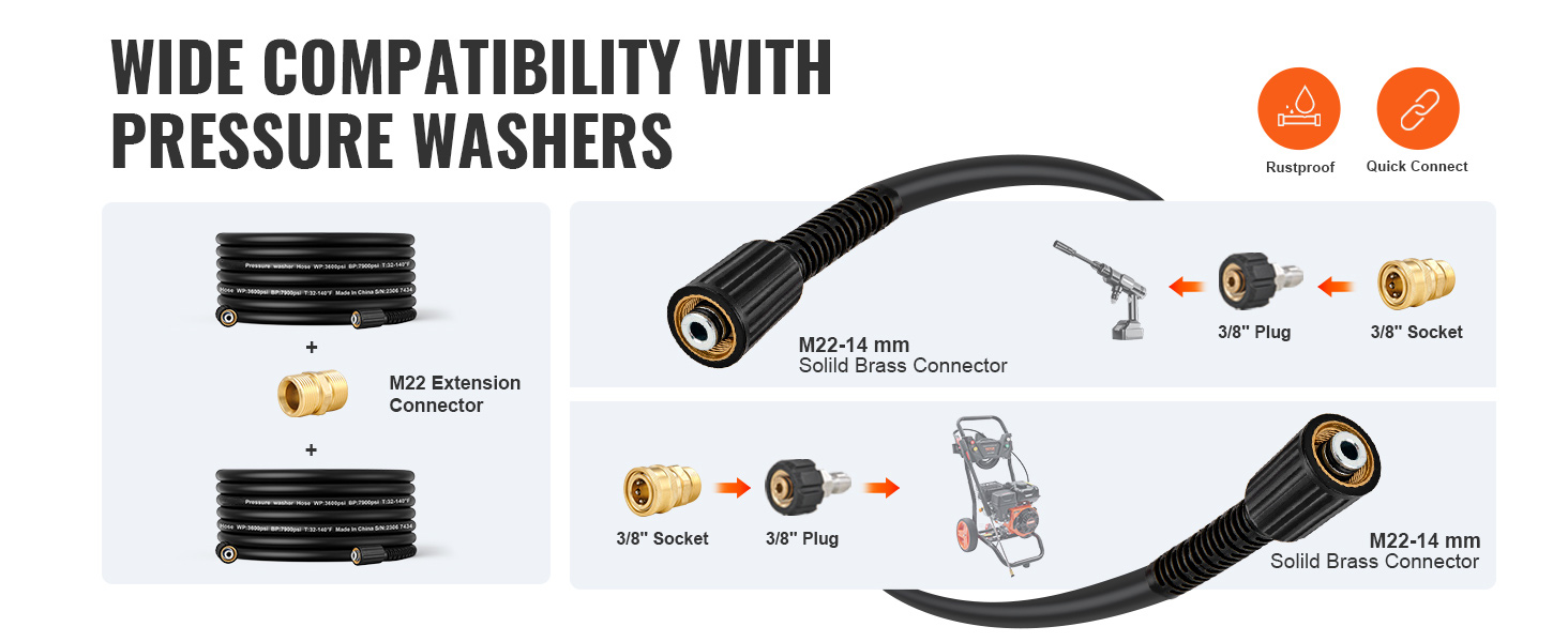 Broad Compatibility:The M22-14mm brass connector ensures a tight, leak-free fit, making it compatible with most standard pressure washer models.